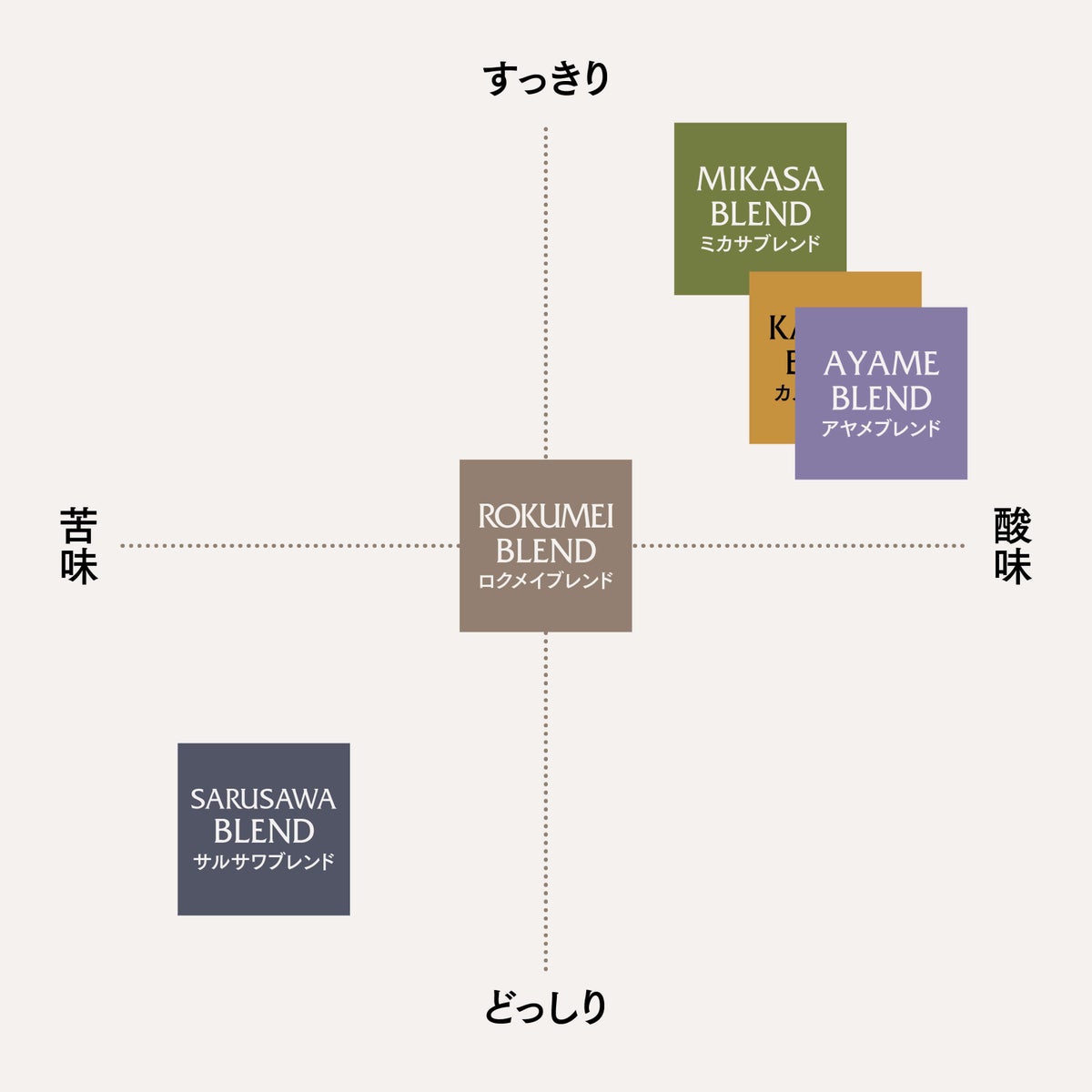 コーヒー豆厳選した15種類以上の焙煎豆から、あなただけの一杯を。 ロクメイコーヒーでは、常時15種類以上のスペシャルティコーヒーをご用意しています。 定番ブレンドから季節を感じる月替わりのブレンド、世界各国のユニークな味わいを感じられるシングルオリジンまで、多彩なラインナップをお楽しみください。 豆袋のサイズは「150g・500g・1kg」からお選びいただけます。 ※ゲイシャなど一部種類によっては、お試ししやすい「75g」サイズをご用意しています。 豆の状態も「豆のまま」「粉」からお選びいただけます。 日本一の実績を持つ焙煎士監修のもと、確かな技術で個性豊かな風味をお届けします。