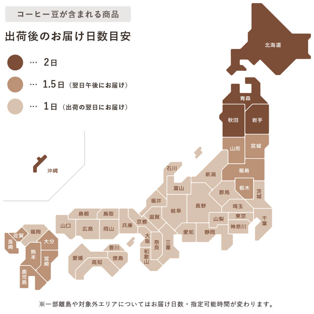 焙煎日の都合で、コーヒー豆(焙煎豆)を含む商品と含まない商品で出荷までの日数が異なります。