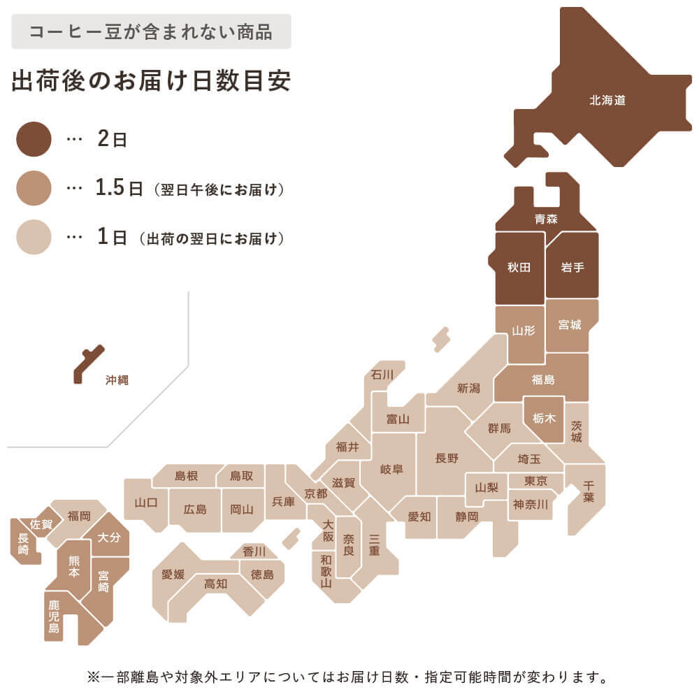 コーヒー豆以外の商品は、当日12時までのご注文で当日出荷、それ以降のご注文で翌営業日に出荷いたします。